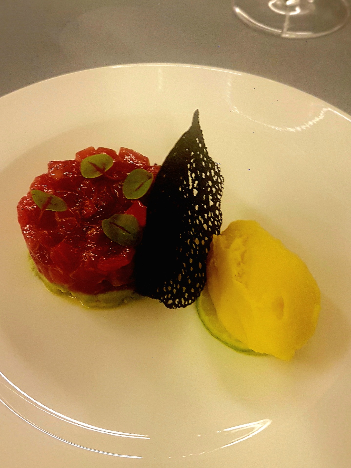 Tartare di tonno, guacamole, croccante di seppia, sorbetto al kalamansi
