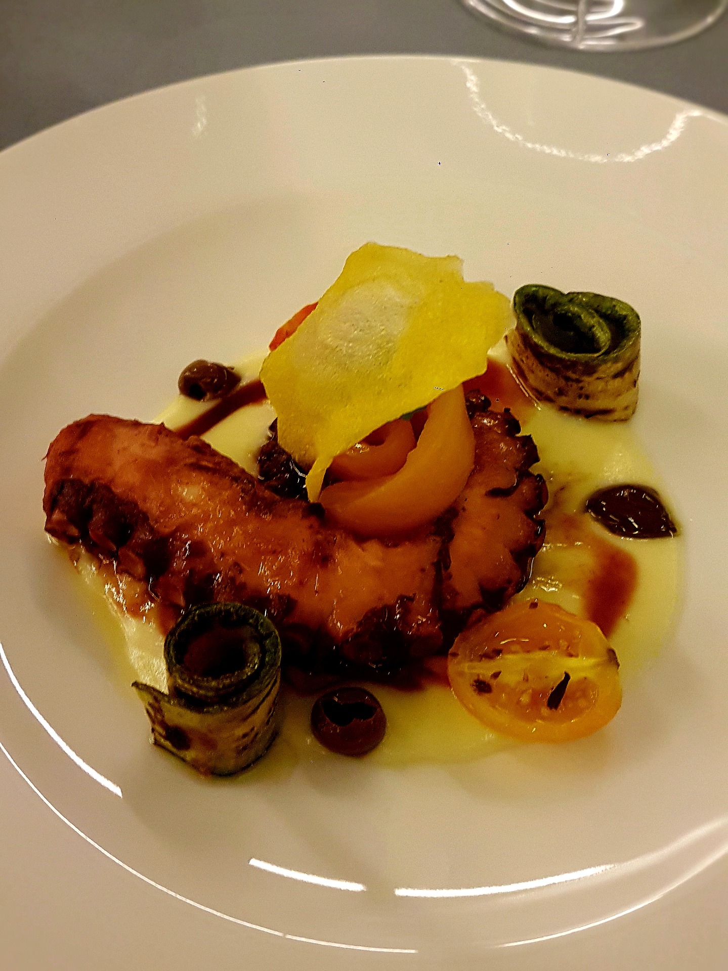 Il tentacolo è cotto a bassa temperatura, risultando tenero e succoso, con una leggera caramellizzazione esterna. È servito su una crema di patate liscia e neutra, che funge da base morbida e avvolgente. Le verdure baby – zucchine, pomodorini, carote – aggiungono colore, croccantezza e una nota vegetale fresca. Il piatto è costruito su una stratificazione di consistenze e su un profilo gustativo che alterna dolcezza, sapidità e delicatezza.
