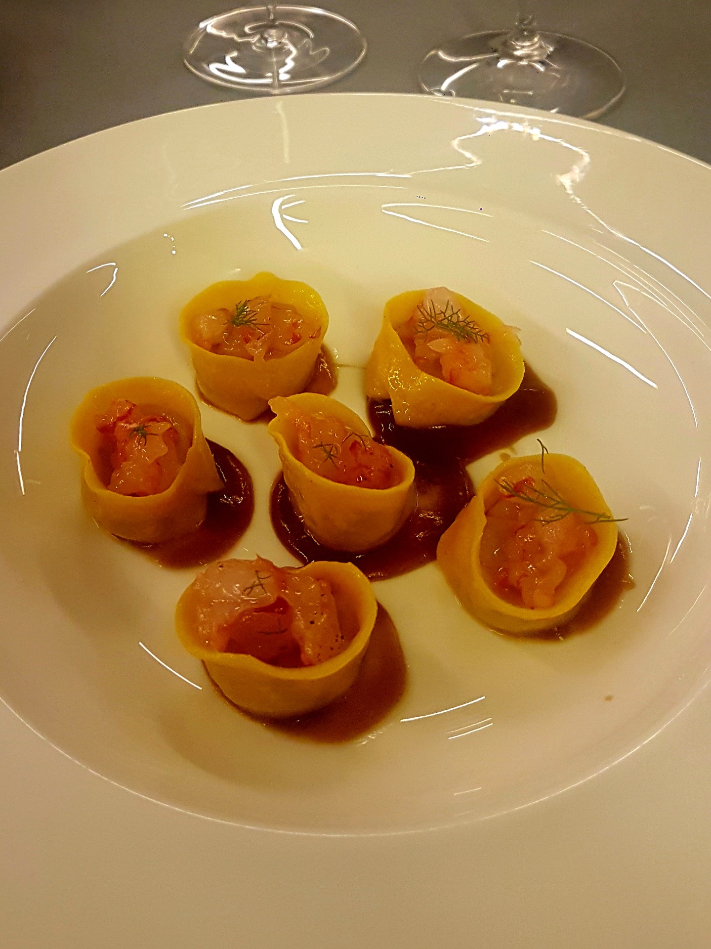 Piatto: Tortelli ripieni di porcini, tartare di gambero marinato, bisque di crostacei.